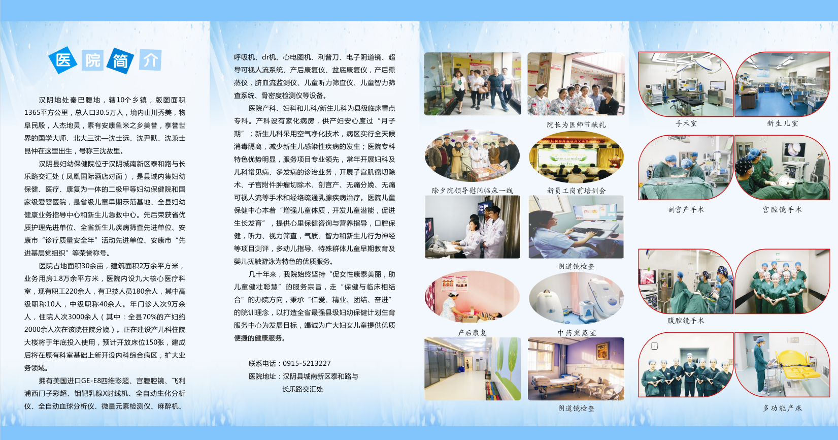 擁有美國進口GE-E8四維彩超、宮腹腔鏡、飛利浦西門子彩超、鉬靶乳腺X射線機、全自動生化分析儀等診療設(shè)備。內(nèi)設(shè)九大核心科室,現(xiàn)有職工220余人,有衛(wèi)技人員180余人,其中高級職稱10人,中級職稱40余人。年門診人次9萬余人,住院人次3000余人,綜合實力位居全省縣級婦幼保健院前例。